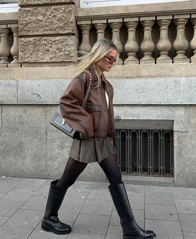 А с чем же носить юбку-мини, чтобы не замерзнуть в холодную погоду? Во-первых, в нашем климате вам не обойтись без колготок. Это могут быть как базовые варианты, так и трендовые яркие. Среди последних наиболее актуальны красные, кобальтовые или бордовые опции, — такие точно сделают из вас модницу. Ну а любителям леопардового принта, советуем обратить внимание и на колготки с таким рисунком. Главное, сочетать их с максимально базовой одеждой: иначе аутфит рискует получиться «перегруженным». Еще поверх колготок можете смело надевать высокие носки или гольфы. Особенно уютно будут выглядеть опции в рубчик. Во-вторых, спрятать ноги от холода помогут высокие сапоги или ботфорты. Они «компенсируют» короткую длину юбки. При этом обувь может быть как на каблуке, так и на плоском ходу, — смотря, что вам больше по вкусу. Среди последних особенно практичны модели на тракторной подошве или платформе: такие помогут визуально удлинить ноги. Еще рекомендуем дополнить юбку многослойным «верхом». К примеру, строгую рубашку сочетайте с теплым свитером с V-образным вырезом и любой верхней одеждой на ваш вкус. Главное, чтобы последняя не была короче юбки. Только в таком случае она «соберет» весь аутфит воедино. Более расслабленным лук получится, если сочетать мини со свитшотом или худи на молнии. Под них надевайте базовую футболку или трикотажный топ, а завершайте образ паркой, пуховиком или дубленкой. Если же соберетесь на свидание или в ресторан, лучшей парой для мини-юбки станет романтичная блуза или водолазка из прозрачного трикотажа. Последнюю предлагаем дополнить лаконичным бра и строгим пиджаком. Финальный штрих — короткая или длинная шуба. Ну а больше идей, с чем носить мини-юбку осенью-2025, ищите в галерее ниже.