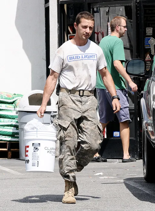 Шайя в образе рабочего, ведро с краской как главный аксессуар будущего лета – позволяет показать бицепсы (для тех, у кого они есть). Ниже талии – бесформенная дань военным и армии – важный социальный комментарий о том, как часто мы забываем о вооруженных конфликтах вокруг нас. Для летних «социальных войн».
