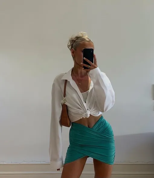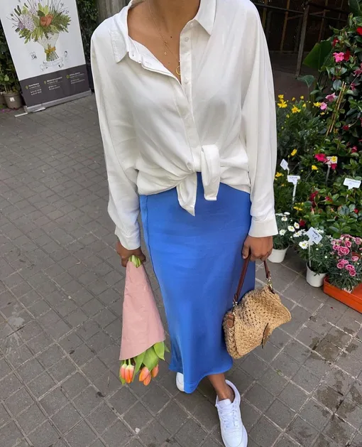 При желании белая рубашка может заменить и трендовый кроп-топ. Для этого ее можно надеть, застегнув лишь на одну пуговицу, либо повязать прямо под грудью небрежным узлом. Сияющая юбка или красивые широкие брюки, изящные украшения и эффектные туфли - и стильный летний образ готов.