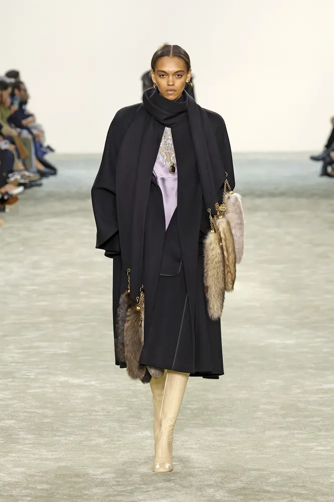 Комбо шарфа и пальто в тон стало ответом дизайнеров на не всегда практичный тренд на колорблок. Бесспорно, слои ярких цветов или неожиданный сочный акцент (например, такой как pop of red) выглядят довольно эффектно, однако это всегда не гарантия стильного образа. Иногда можно случайно неправильно выбрать оттенки и пропорции, вследствие чего превратить базовый комплект из модного заявления в антитренд. С монохромом такого не произойдет — это всегда безопасный и актуальный выбор, который сделает ваш образ элегантным и запоминающимся. Да-да, не стоит полагать, что однотон — это скучно. Достаточно взглянуть на дуэты из пальто и шарфа с показов Brandon Maxwell и Chloé.