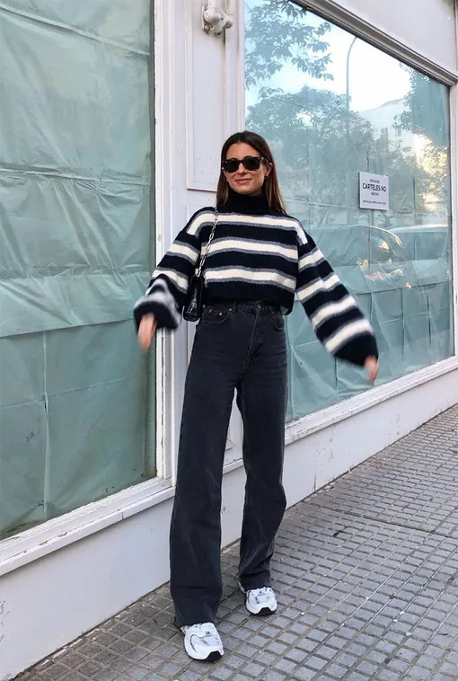 Безусловно, такие простые комплекты всегда можно «усложнить» аксессуарами – к примеру, принтованным шелковым платком, акцентным ремнем или даже яркими носками. Для тех, кто предпочитает минимализм, есть беспроигрышный вариант – брать формой. Сочетайте джинсы wide leg с укороченным свитером в полоску и массивными кроссовками как из 80-х. Подчеркивайте талию широким ремнем – вуаля, умопомрачительный эффект от образа обеспечен.