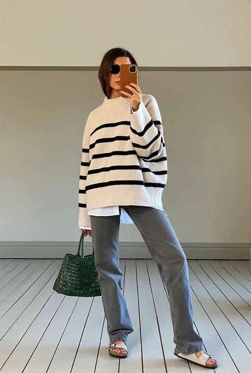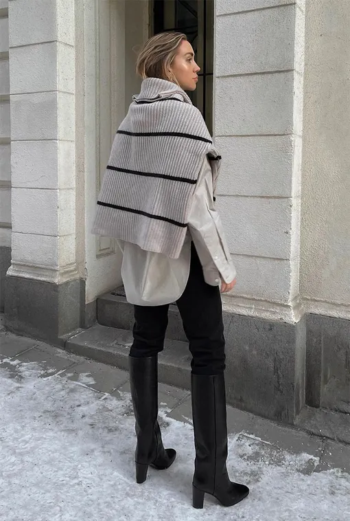 Помимо «быстрых» трендов модницы в соцсетях не забывают и о классике жанра. Да, в этом сезоне мы можем носить любимый полосатый свитер с однотонными брюками во всех вариациях. Пока зима не планирует сдавать позиций, самый актуальный прием – многослойность. Пусть белая рубашка небрежно торчит из-под полосатого джемпера. Дополняйте образ ультрамодной «плетеной» сумкой и солнцезащитными очками – почему бы и нет? К слову, свитер не обязывает вас носить его по своему прямому назначению. Всегда есть вариант использовать джемпер в качестве уютного шарфа. Так, самая непримечательная рубашка из эко-кожи заиграет в образе по-новому – осталось приправить его трендовыми сапогами с широким голенищем.