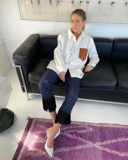 Эльза Хоск демонстрирует еще одно сочетание с рубашкой, заменяющей джинсовую куртку или бомбер. Носите ее поверх базового трикотажного кроп-топа и плиссированной мини-юбки — желательно с высокой талией. Добавить в этот женственный образ каплю брутальности помогут актуальные кеды на платформе.