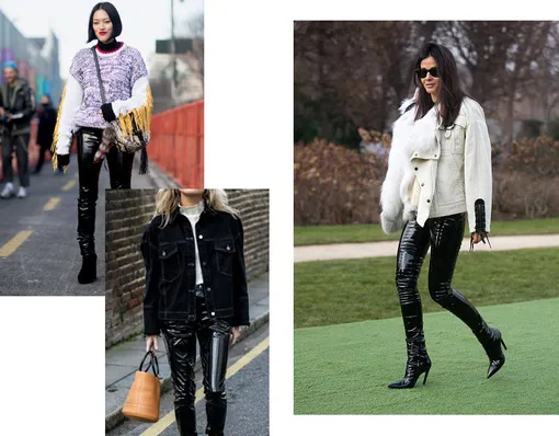 Восстанавливая репутацию черного латекса, главное - сбить с него фетишистский налет. Для этого стоит брать в пример поклонников таких брюк не из нулевых, когда их носили с оранжевым загаром, туфлями на шпильке и прочим шиком жен футболистов, а из 60-70-х, когда на вещи из винила случился настоящий бум. Выбирайте укороченные расклешенные модели посвободнее и сочетайте их с белой футболкой, обычными сникерсами, серым свитером, клубным пиджаком или классическим бушлатом. Набор подружки рок-музыканта в виде черной косухи и казаков тоже подойдет.