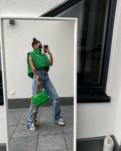 Широкие длинные джинсы вернулись к нам из 90-х. Тогда их носили реперы, сочетая с майками с логотипами баскетбольных групп, банданами и массивными цепями. В этом сезоне модники предлагают делать все то же самое, ведь эпоха 90-х все еще находится в тренде. В качестве обуви подойдут армейские ботинки и кроссовки на массивной подошве, а также любая обувь, которая заставит джинсы волочиться по полу не слишком сильно.