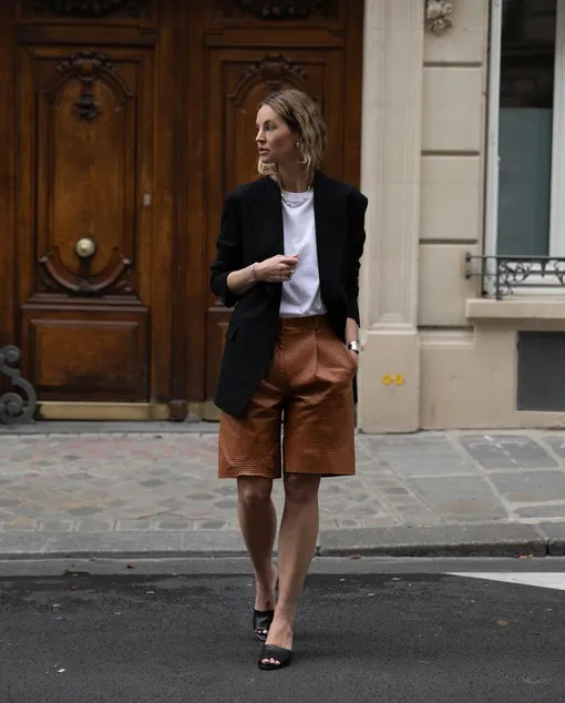 Классная альтернатива брючному костюму на лето — комбо из жакета и длинных шортов. Это может быть костюм с шотами, а могут быть отдельные опции контрастных цветов, которые с легкостью можно будет носить и по отдельности. В рубашке под пиджаком летом может быть слишком жарко, поэтому вместо нее лучше надеть топ или трикотажную майку. Обувь к этому комбо подойдет любая: от кроссовок до мюлей на каблуке.