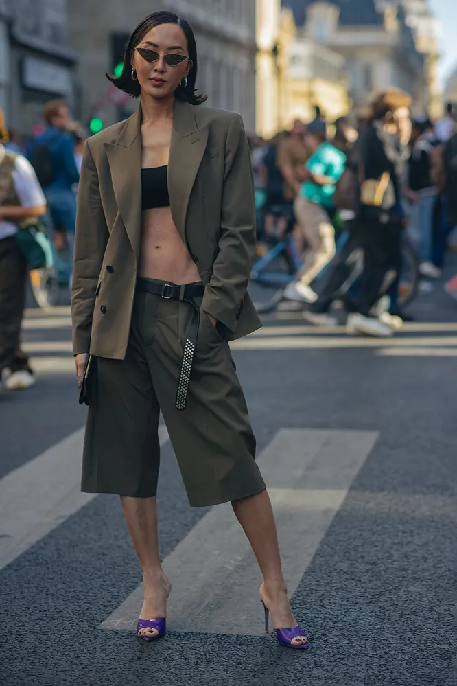 Классная альтернатива брючному костюму на лето — комбо из жакета и длинных шортов. Это может быть костюм с шотами, а могут быть отдельные опции контрастных цветов, которые с легкостью можно будет носить и по отдельности. В рубашке под пиджаком летом может быть слишком жарко, поэтому вместо нее лучше надеть топ или трикотажную майку. Обувь к этому комбо подойдет любая: от кроссовок до мюлей на каблуке.