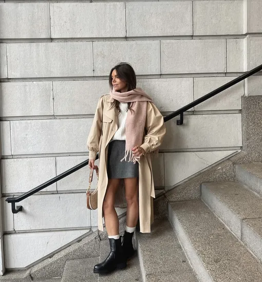Ботинки челси — самая универсальная пара из всех существующих, так что смотреться они будут отлично с юбкой практически любых длины и фасона. Однако этой зимой мы предлагаем носить их в комбо с вязаной юбкой мини. Это удобно и очень стильно. Особенно, если выбрать такой же уютный трикотажный верх — в тон к юбке или контрастный.