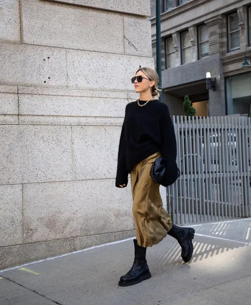 Еще одно комбо из категории «сочетание несочетаемого» женственная миди из струящегося шелка в сочетании с актуальными в этом сезоне массивными ботинками. Как и в случае с макси, здесь будет отлично смотреться любой верх: от шерстяного оверсайз-кардигана до простого лонгслива из хлопка. Если подол юбки заканчивается раньше, чем начинается голенище ботинка, обязательно дополните наряд колготками в тон к обуви. Так ботинки не будут «резать» рост.