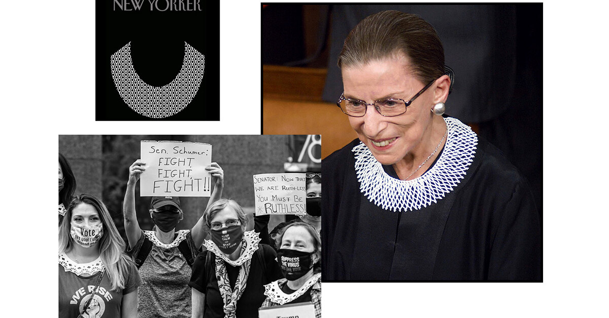 Воротнички стали настоящим символом Рут Бейдер Гинзбург: не зря посвященная ей обложка New Yorker была полностью черным, с одним только контуром белоснежного воротника. Но символом не только ее самой — а в целом борьюы за права и свободу. И мастерицы со всего мира после смерти Гинзбург запустили флэшмоб, назав выкладывать фотографии своих работ с хэштегом #knitoriousrbg — и другими похожими. Кто-то вышивал воротнички на свитерах, как когда-то Эльза Скиапарелли, а кто-то — на защитных масках: что все женщины, цитируем один из постов, могли выразить свое общее осуждение тому, что творится вокруг сегодня.