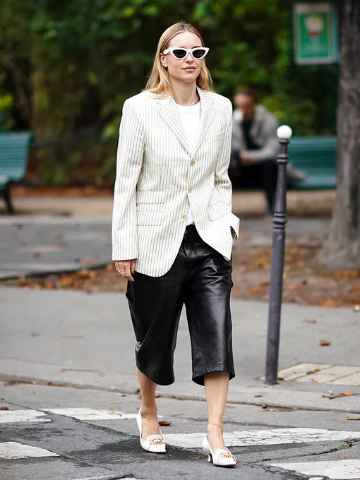 Saint Laurent демонстрирует нам лук, который при правильном подборе вещей запросто станет деловым. Объединить элегантные удлиненные шорты с твидовым жакетом — идея не новая. Однако в прочтении бренда это сочетание выглядит свежо и необычно. Не последнюю роль здесь играет классический жилет и пара слингбэков с металлизированным мысом. Если последние выглядят абсолютно универсальными, то под жакет можно надеть блузу с бантом — эффект останется прежним, но лук приобретет более деловой вид. Если же поход в офис не планируется, образ не пострадает, если вы отдадите предпочтение черным велосипедкам.