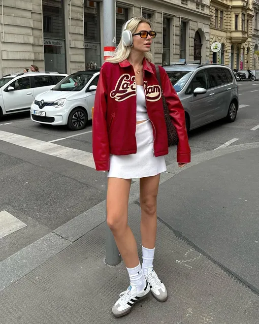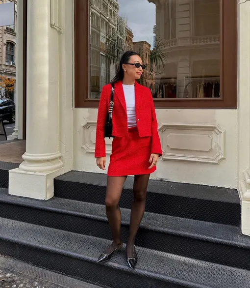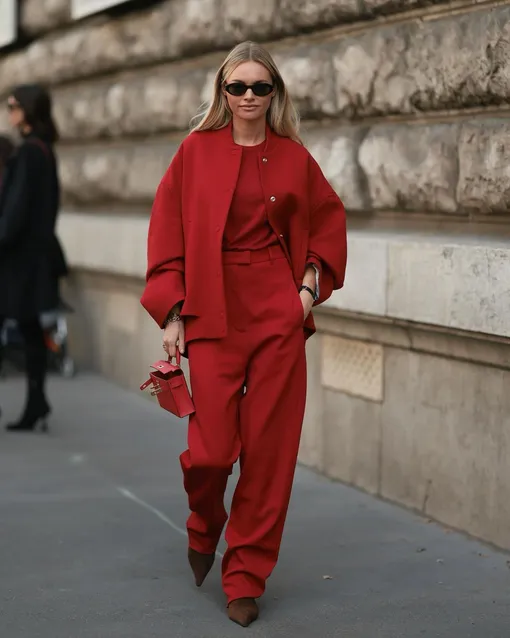Еще одна комбинация для повседневных аутфитов — красный + белый. В этом комбо красный легко сможет заменить черный или серый. А белый сделает этот оттенок еще более насыщенным и наряд будет выглядеть куда эффектнее. Например, вы можете красный костюм дополнить белым лонгсливом, рубашкой или тонким свитером. Еще один вариант — белый тотал-лук с акцентыми деталями.