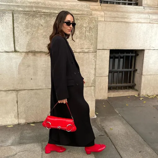 Красный + черный — еще один «беспроигрышный вариант» для тех, кто пока боится ярких оттенков. Черный приглушает красный, за счет этого образ выглядит менее вызывающе. Тут можно опять воспользоваться приемом: красный верх и черных низ. Или наоборот. Нам особенно нравится, когда к черному тотал-луку добавляется яркий элемент. Это может быть сумка или обувь. Или все вместе. Так, красные акценты приглушают официоз черных аутфитов. В общем, получается идеальный тандем!