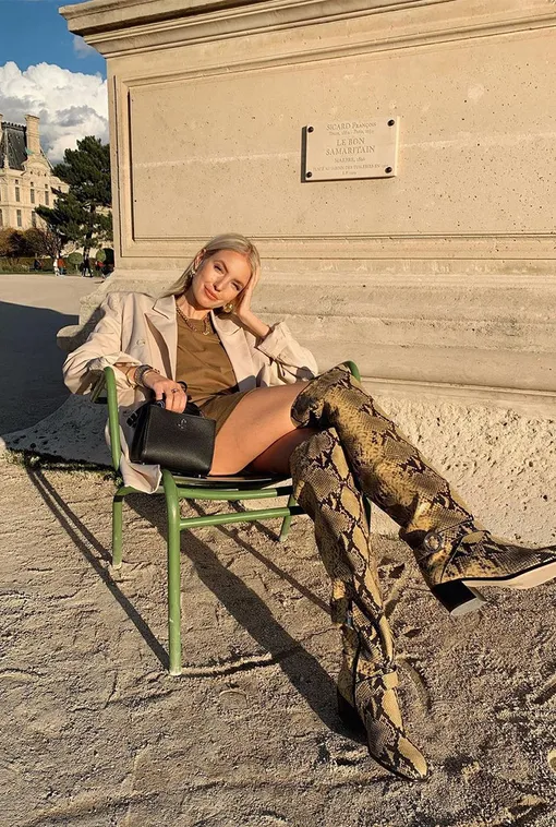 Есть вариант поярче – комбинировать «хищную» обувь с принтованными вещами. Сочетайте клетчатую юбку со «звериными» сапогами с широким голенищем или приправляйте базовый аутфит сразу двумя «зверюшками» – зебровой сумкой и леопардовыми кроссовками, например. Для самых смелых мы приберегли взрывной вариант – конечно, не могло обойтись без хищного тотал-лука. Носите змеиные сапоги с таким же кожаным жакетом и брюками с разрезами в тон – настоящая терапия принтом выглядит именно так!