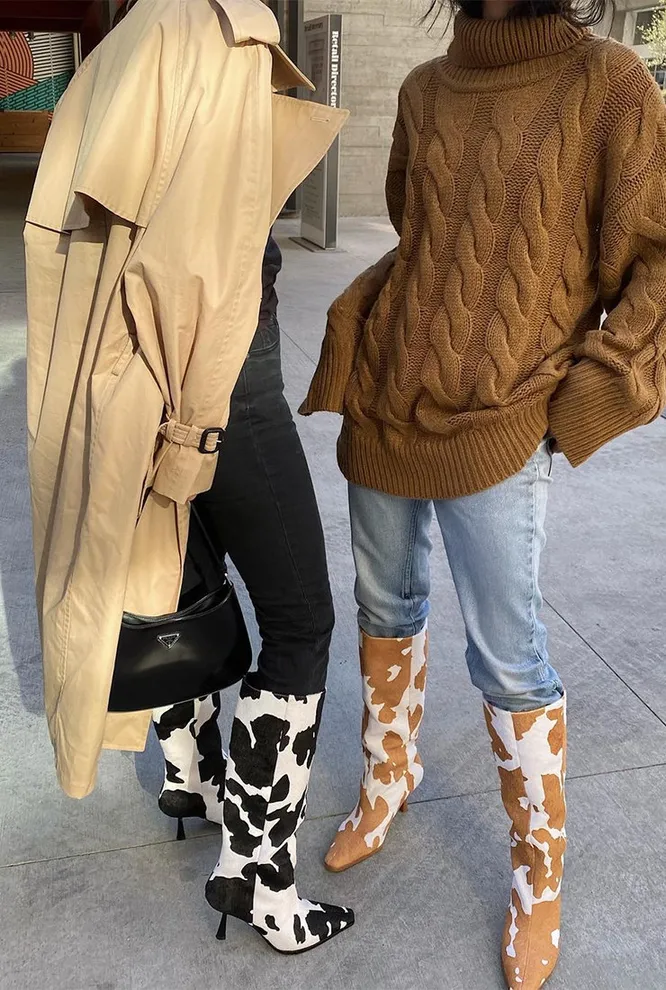 Есть вариант поярче – комбинировать «хищную» обувь с принтованными вещами. Сочетайте клетчатую юбку со «звериными» сапогами с широким голенищем или приправляйте базовый аутфит сразу двумя «зверюшками» – зебровой сумкой и леопардовыми кроссовками, например. Для самых смелых мы приберегли взрывной вариант – конечно, не могло обойтись без хищного тотал-лука. Носите змеиные сапоги с таким же кожаным жакетом и брюками с разрезами в тон – настоящая терапия принтом выглядит именно так!
