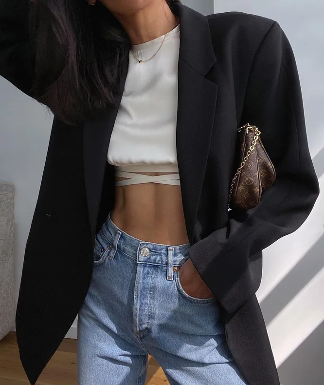 Пускай приталенные пиджаки несколько сдали свои позиции в сравнении с оверсайз-моделями, они все еще остаются на модной арене. Главное — не сочетать их с джинсами. Такой наряд будет выглядеть устаревшим и едва ли вас украсит. Подбирая пиджак к джинсам, обратите внимание на модели прямого кроя с объемными плечами. Они отлично подойдут любой фигуре и отлично дополнят деним.