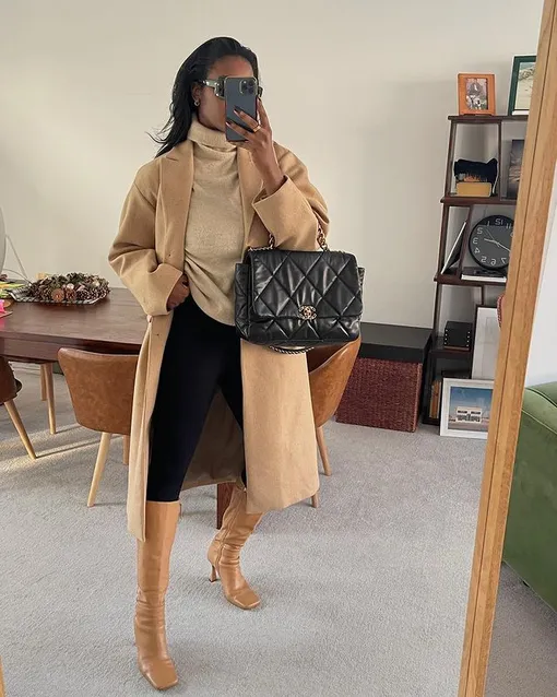 Комбо из черных леггинсов и сапог до колена — одно из самых актуальных в этом сезоне. Чтобы уравновесить облегающий низ, дополнить его стоит объемным свитером бежевого цвета. Так образ получится гармоничным. В качестве верхней одежды подойдет все, что угодно: от дубленки до пуховика