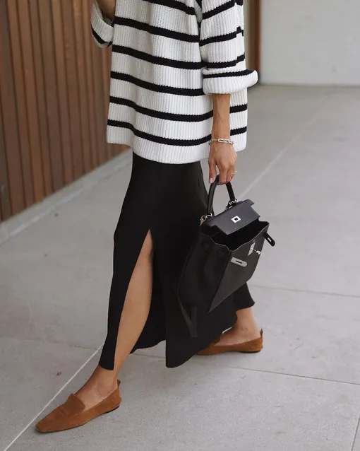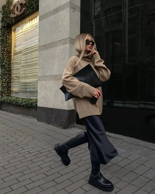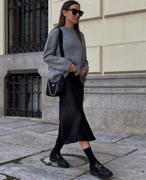 Это сочетание гораздо более универсальное, чем может показаться на первый взгляд. В зависимости от того, какой обувью и аксессуарами вы дополните это комбо, на выходе получится масса стильных и подходящих для самых разных случаев образов. В офис носите шелковую юбку черную юбку со свитером базового цвета и лоферами. К последним, кстати можно добавить высокие носки — под цвет обуви или контрастные. Этот давно забытый модный прием стал снова невероятно актуальным в этом сезоне. Для создания более женственного и элегантного образа смените лоферы на ботфорты на устойчивом каблуке, а к свитеру добавьте нить жемчуга или модную цепь. Если вы хотите создать максимально расслабленный комфортный образ, смело обувайте кеды или кроссовки — они подойдут к юбке ничуть не хуже. Свитер можно надеть на голое тело, а можно добавить под него рубашку — классический отложной воротник, выглядывающий из-под трикотажа, добавит наряду необходимую изюминку. Пока тепло, поверх свитера можно ничего не надевать, а когда похолодает еще сильнее, отличным дополнением к этом комбо станет двубортное пальто длины макси и яркий шарф.