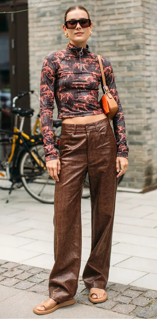 Кожаные брюки тоже заняли заметное место в осенне-зимних коллекциях. Здесь есть лишь два модных варианта. В первую очередь стоит присмотреться к моделям прямого кроя. Они идут всем, уравновешивают силуэт и подходит практически к любому верху. Другой модный фасон — узкие брюки-клеш. Необычное и достаточно дерзкое решение смотрится очень эффектно в сочетании с топами и блузами в стиле нулевых.