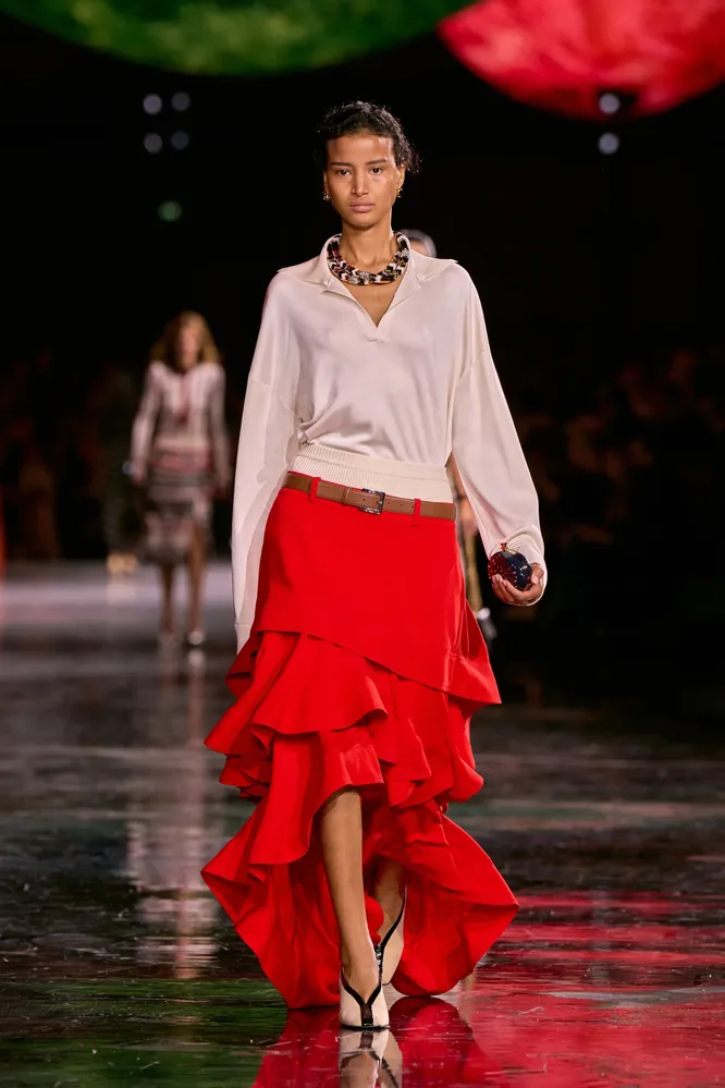 Что мы видим на подиуме? Дизайнеры предлагают разные прочтения. Chanel делает ставку на красную опцию с асимметричным подолом, а Blumarine и Dior на воздушные белые юбки. Чемена Камали в Chloé все еще верна бохо-курсу. А Alaïa напомнил, что всегда было сутью бренда — уникальный крой. Так, родились версии с панье-силуэтом. Макси-юбка с воланами — не просто очередной всплеск тенденции, а возвращение к идее женственной одежды с характером. Уверены, у вас не возникнет проблем со стилизацией, так как эффектная макси не диктует правила, а предлагает экспериментировать. Смело играйте со слоями, фактурами, пропорциями.