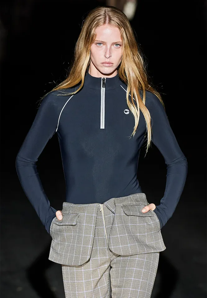 Кроме того, если летом мы предпочитали модели на бретелях или даже бандо, то зимой стоит выбирать вещи с длинным рукавом. Они могут быть очень разными: от минималистичных моделей, которыми славится бренд Ким Кардашьян Skims, до золотистого боди с показа Burberry. Впрочем, в зимние образы можно встроить и вещи на тонких бретелях, ведь они отлично смотрятся вместе с объемным кардиганом крупной вязки. А чтобы образ не был скучным, присмотритесь к боди с принтами — полоской, логотипами или даже модной шахматной клеткой, как у бренда Private Policy.