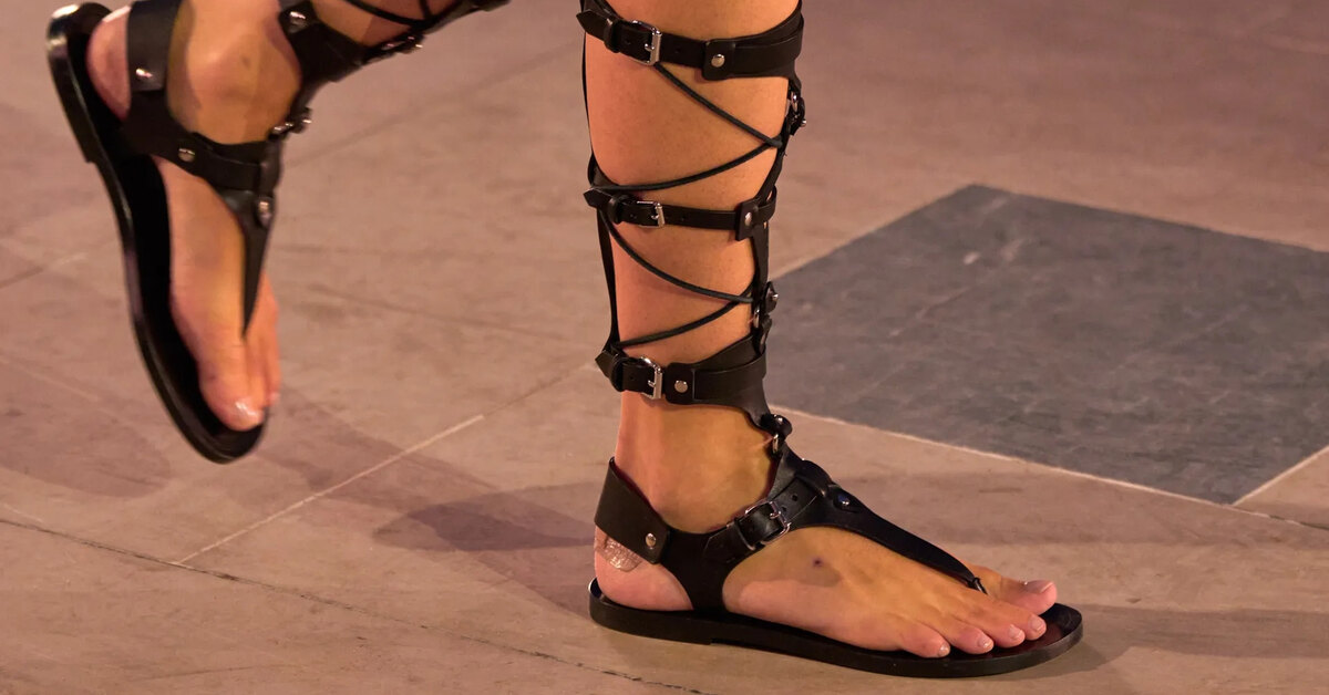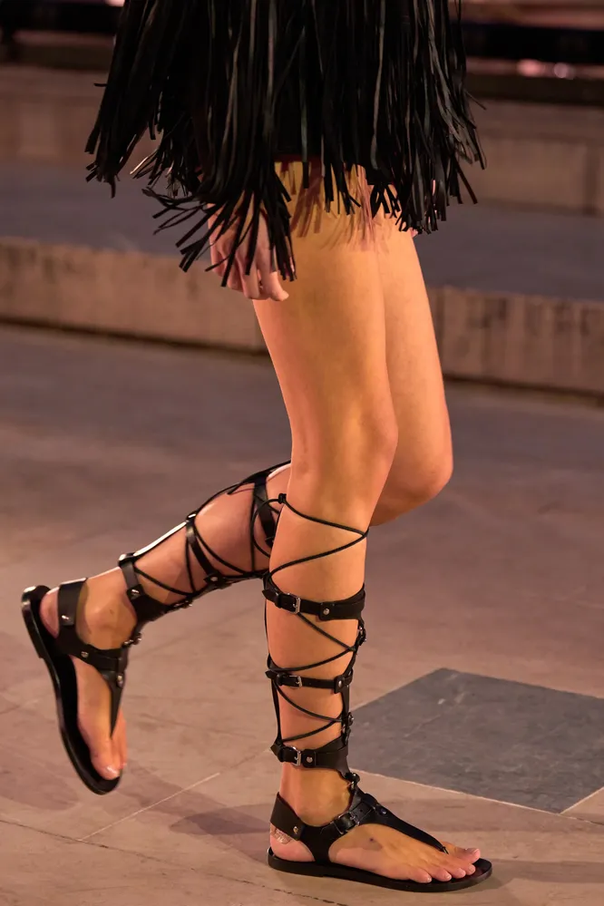 Увлечение модельеров разнообразными завязками — результат вернувшегося стиля бохо — распространилось не только на одежду, но и на обувь. Бренды «плетут» из них туфли, мюли, босоножки и, конечно, сандалии. А какая модель лучше, чем «гладиаторы», воплощает эту идею? С тонкими кожаными ремешками, обхватывающими лодыжку или с очень длинными шнурками, доходящими до колена, как у Isabel Marant, — вариантов много, выбирайте на свой вкус.