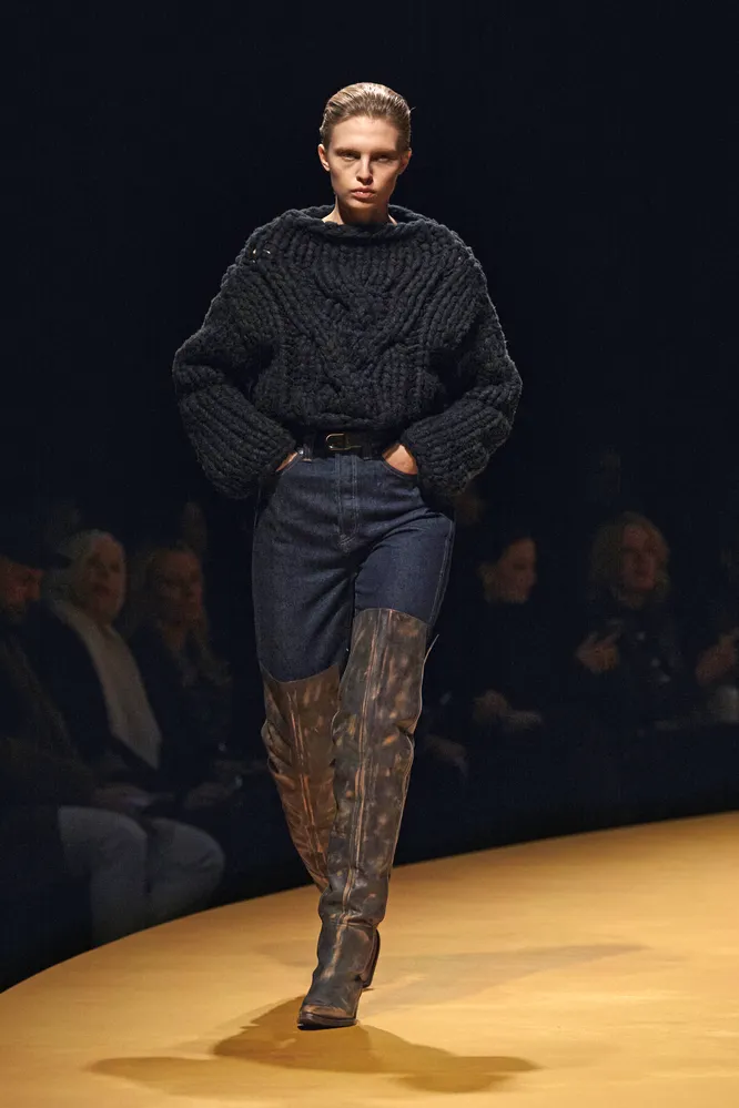 Стилизовать такие сапоги можно как с романтичными ladylike-платьями, так и с леггинсами, создавая расслабленный комплект на каждый день. Также не стесняйтесь надевать их прямо на брюки — как это делают Ralph Lauren: благодаря такому незамысловатому стайл-трику можно собрать контрастный аутфит, в котором точно не будет холодно в переменчивую демисезонную погоду. Не стоит полагать, что их можно носить исключительно с теплой верхней одеждой — достаточно взглянуть на мужской показ Saint Laurent и вдохновиться довольно неоднозначным сочетанием строгого костюма-пауэрсьюта с экстра-высокими рыбацкими сапогами, надетыми прямо на офисные штаны прямого кроя.