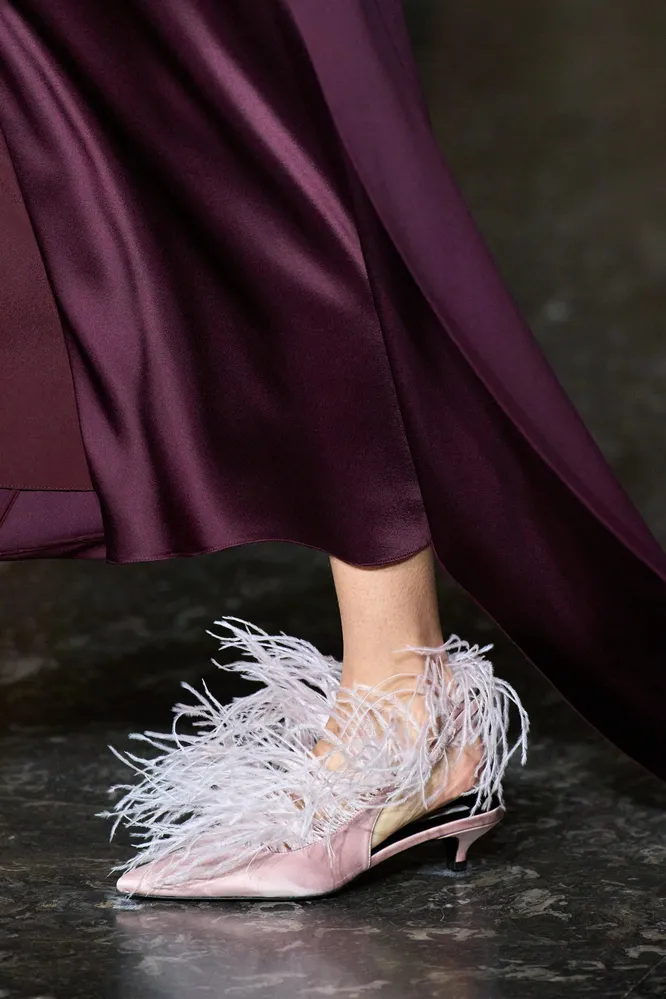 Дизайнеры уже не первый год заботятся о том, чтобы красивая обувь была еще и удобной. Именно поэтому в коллекциях часто можно встретить туфли на небольшом устойчивом каблуке. В коллекции сезона осень-зима 2024/25 Миучча Прада снабдила таким каблуком изящные атласные лодочки с декоративными ремешками. Выглядит такая пара по-настоящему эффектно, а ходить в ней можно будет весь день, не испытывая ни малейшего дискомфорта.