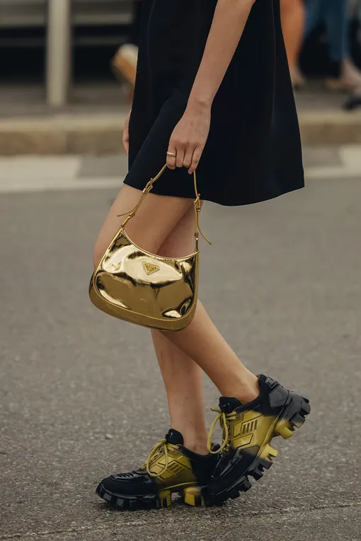 Еще одна комбинация, опасная с точки зрения пропорций, — это юбка миди и кроссовки. Здесь дело одновременно в закрытом подъеме (работает та же схема, что и с платьем-карандашом), и в особенностях кроя самой обуви. В такой одежде силуэт получится «приплюснутым», а ноги — визуально короче. Исключение: если на юбке есть высокий разрез — этот элемент полностью меняет пропорции и ноги не будут выглядеть короткими даже в кроссовках. Если же разреза нет, юбку лучше сочетать с обувью на каблуке, либо балетками или лоферами.
