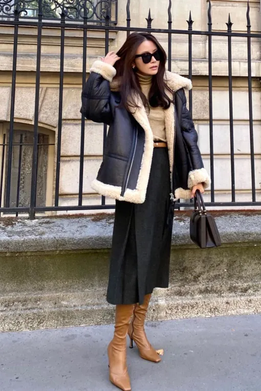 Ботфорты на каблуке — самая необходимая обувь в этом сезоне, которая остается лучшей парой для юбки средней длины: такое комбо 100% не позволит замерзнуть и всегда будет выглядеть стильно. Сапоги могут создавать с юбкой монохромную комбинацию, а могут — эффектный контраст.