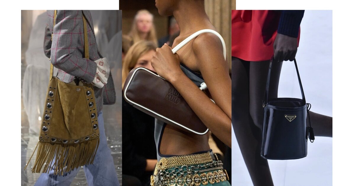 В тренды сумок на 2025 год вновь попали и удобные модели, напоминающие по форме ведра. Их вытянутая форма и минималистичный дизайн делают их очень универсальными и подходящими для любого случая. Они могут быть из любого материала: матовой или лаковой кожи, как на показе Prada, замши или плетеной рафии, — все зависит только от ваших предпочтений. Еще для элегантных и сдержанных образов здорово подойдут сдержанные сумки базовых цветов. Но если вы в поиске действительно интересных аксессуаров, берите на вооружение опции ярких оттенков или с принтом.