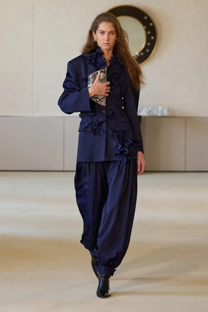 С появлением компактного аксессуара в вашей жизни быстро придет осознание, что ежедневный набор вещей может быть намного скромнее, чем нам всегда казалось. Большая косметичка, объемный кошелек, ежедневник и книга зачастую оказываются лишними. Вам больше не нужно нагружать спину, а достаточно взять с собой картхолдер, корректор, бальзам для губ и таблетницу. Еще один плюс — клатч легко адаптируется к повседневным образам и органично вписывается даже в самый базовый гардероб. После длительного перерыва клатчи снова заняли заметное место в коллекциях ведущих брендов. Новое «поколение» отличается разнообразием форм и текстур. На показе Chanel главным акцентом стала бордовая миниатюрная сумка, мгновенно привлекшая внимание. Матье Блази интегрировал ее в комплект из черной юбки и белой рубашки. У Khaite вариант Audrey с крокодиловым тиснением в насыщенном красном оттенке идеально сочетается с кожаным жакетом-кейпом. Bottega Veneta и Celine поддержали идею дневного клатча, сочетая его с брюками и джинсами. Похожий прием появился и у Stella McCartney, где лазурный элемент комбинировался с серым костюмом. Общий посыл считывается легко: клатч больше не привязан к вечернему дресс-коду и уверенно занимает место универсального дневного аксессуара.