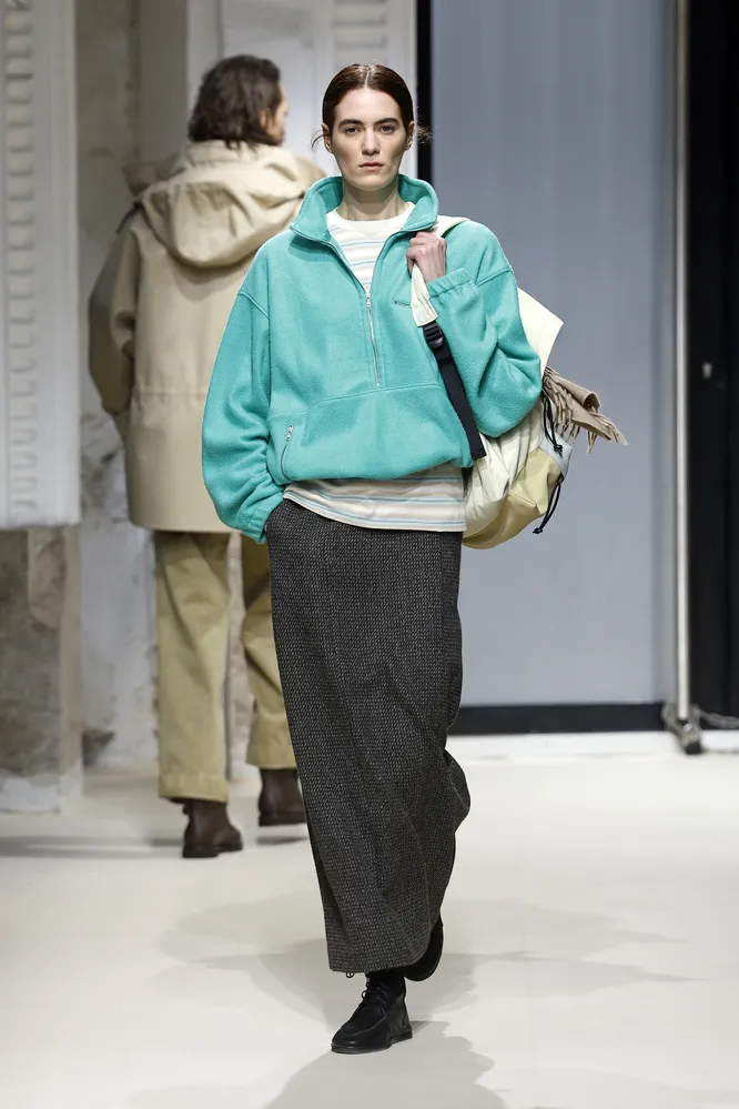 Но что делать, если хочется оставить в комплекте женственный стиль и надеть юбку? Так даже лучше, ведь с помощью приема контраста у вас может получиться гармоничный образ с шерстяной миди или трикотажной макси, приправленный канонично спортивным верхом — например, анораком с воротником-стойкой и акцентными карманами. Не бойтесь играть с пропорциями и находить максимально неожиданные сочетания — любой ladylike-низ, например, аккуратная юбка-годе, высокие сапоги на каблуке или даже лодочки придутся как нельзя кстати.