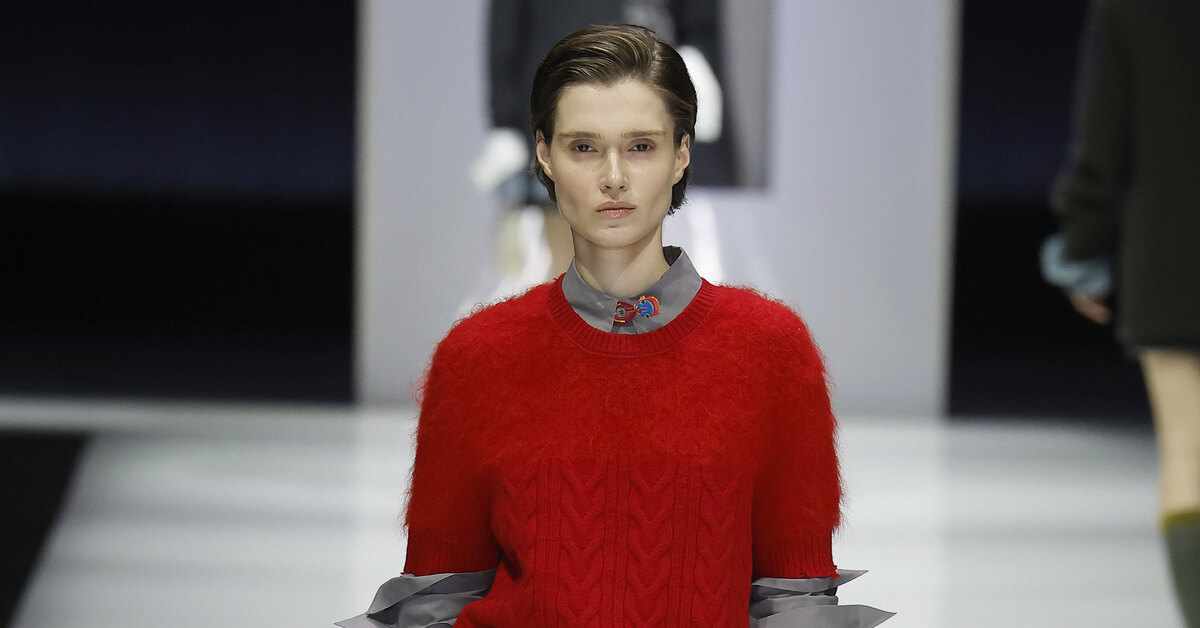 Для тех, кто ищет более спокойное решение. Серое пальто в дуэте с красным джемпером — баланс между сдержанностью и экспрессией. Этот ансамбль подойдет на каждый день, ведь он выглядит строго, но не скучно.