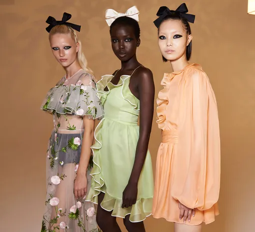 Такого завидного единодушия не наблюдалось давно. И если, скажем, от Simone Rocha и Miu Miu мы именно этого и ждали (такие девичьи платья — «визитные карточки» обоих бренда), то во всех остальных случаях без сюрпризов не обошлось. Обычно ироничный Джереми Скотт устроил для Moschino удивительно трогательную презентацию с настоящим кукольным театром (так что его платья получились кукольными в самом прямом смысле этого слова!). Сара Бертон обратилась к уязвимой и по-девичьи изящной стороне эстетики Alexander McQueen — и показала пышные розовые платья-облака (для баланса — с грубыми «армейскими» ботинками). А Джамбаттиста Валли обновил свои знаковые платья из многослойного тюля — и сделал их легче и современнее, оставив при этом свойственную им романтичность.