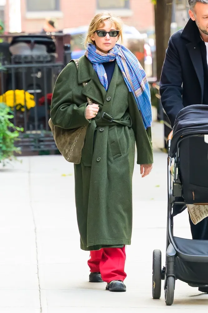 Переключаясь с темы аксессуаров на одежду, помним о самом главном стайлинг-правиле актрисы — носить оверсайз с оверсайзом. «Нельзя носить обтягивающий "низ" с объемным "верхом", иначе вы будете выглядеть как лампа», — поделилась Дженнифер Лоуренс в недавнем интервью. Не менее важный способ разнообразить актуальный образ, которым пользуется актриса, — игра с цветами и принтами. Так, например, она остается верна классическому леопарду — не важно, пальто ли это, или акцентная шапка. Также актриса не забывает о таких модных паттернах как полоска, цветы и клетка — чаще всего они занимают второстепенное место в комплекте с помощью шарфов и других аксессуаров. Колорблок — еще одно важное правило при формировании аутфитов для Лоуренс. Оно не всегда проигрывается в пропорциях 50 на 50 — часто она разбавляет массивное ярко-зеленое пальто в макси длине сочными красными джоггерами, а леопардовое пальто — заметным шарфом. Что касается обуви, то Дженнифер всегда делает упор на удобных парах. Будь то ботинки на тракторной подошве, мягкие, словно тапочки, угги или ботинки-хайкеры — они всегда отлично сочетаются с остальным образом благодаря их вневременному дизайну и некричащим цветам.