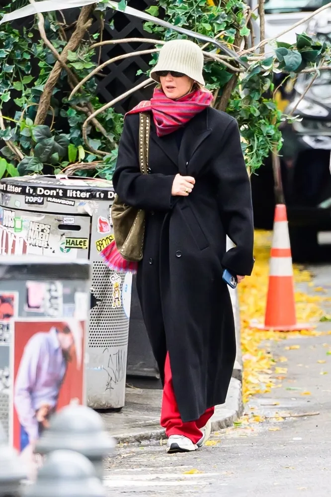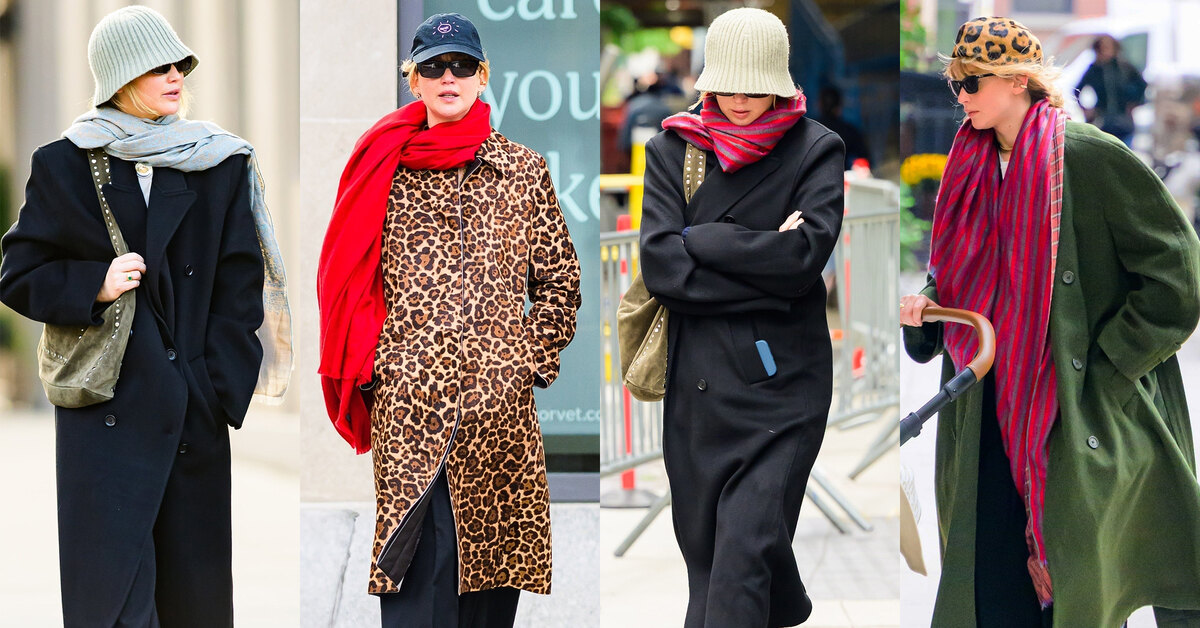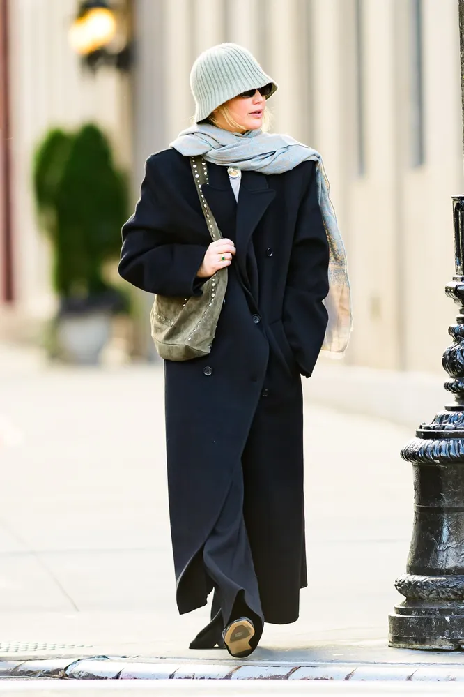 Один из самых любимых модных приемов Лоуренс — акцентный шарф. Причем он может быть как заметно яркого цвета, например, красного, так и любого нейтрального оттенка, который отличается от пальто. Для тех, кто предпочитает менее сочные цветовые сочетания, мы рекомендуем углубиться в классическую палитру и присмотреть к шарфам благородных оттенков — например, бордовому, коричневому, темно-синему и графитовому. Другой вариант — использовать прием pop of red, который так сильно любит Дженнифер, и интегрировать ярко-красный аксессуар в базовый образ. Еще один стайл-трик от Лоуренс — заметный головной убор. И речь сейчас идет не о наскучившей шапке-бини или банальном берете. Актриса часто делает выбор в пользу необычной шляпы-таблетки, преппи-кепки или шапки-колокольчик, которые преобразят комплект в одно мгновение и избавят вас от необходимости дополнительной стилизации.