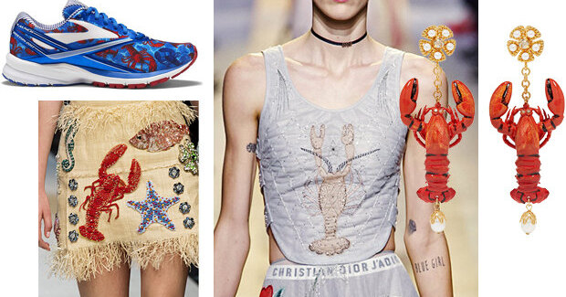 Спустя 80 лет лобстеры в палитре от нежно-розового до кораллового поселились на топах Christian Dior и Peter Jensen, юбках Lena Hoschek и платьях Attico, а также украсили сумки Gucci, слиперы Kurt Geiger и специальную бостонскую серию кроссовок Brooks. Но самые аппетитные - в виде серег на моделях с показа Dolce & Gabbana.