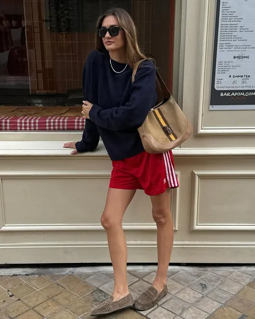 Куда же без спорт-шик лука — тем более, эта трендовая стилистика легко поможет «вписать» в образ такую строгую пару как лоферы. Запоминаем три главных составляющих такого комплекта — спортивные шорты с лампасами, базовый джемпер в нейтральном тоне и вместительная сумка из замши. При желании можно надеть ободок или повязку на волосы, которая будет сдерживать их от сильных порывов ветра.