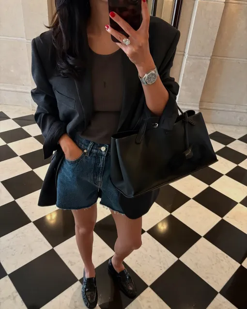 Если вы устали от скучных офисных луков, но хотите идеально попасть в дресс-код во время нестабильной погоды последнего месяца лета — то этот комплект из классического пиджака и шортов-бермудов идеально поможет в создании корпоративного комплекта для август. На забудьте надеть под пиджак простую спортивную майку или топ-бандо, если у вас есть планы после работы.