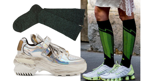 Одна из самых частых комбинаций массивных кроссовок — с длинными носками, которые могут доходить до колена. Сейчас, конечно, для большей части России такая пара окажется слишком холодной. Но в то же время длинные носки очень уютно смотрятся поверх колгот — плотных или, наоборот, классических капроновых. Главное — подбирать близкие по цвету модели. А вот массивные кроссовки служат так же верно и практично, как и осенние ботинки, — долго не промокают, не пропускают холод, их сложнее запачкать. Носите такие кроссовки с традиционными вязаными носками, со спортивными гольфами, с праздничными вариантами из люрекса и простыми моделями с разноцветными полосами.
