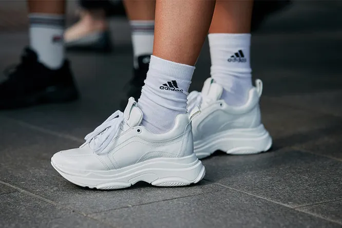 Массивные кроссовки + длинные носки — практичное сочетание для тех, кто не любит сапоги