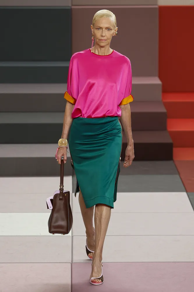 На какие предметы одежды из сатина стоит обратить внимание? Конечно, самый распространенный вариант — это платья. Не но простые, а нарядные, как у диснеевской принцессы. Торжественности образу добавит пышная юбка или объемные банты на подоле или топе изделия. Также отличной идеей станет костюм с юбкой в духе Chanel, но не из твида, а из трендового сатина — визуализировать его поможет модель с дебютного показа Мигеля Кастро Фрайтаса для Mugler. Струящаяся ткань словно вдохнула новую жизнь в этот довольно строгий комплект и «освежил» его с помощью фактуры и цвета. Однако не стоит полагать, что этот материал подходят лишь для вечерних выходов или строгих мероприятий с дресс-кодом black tie. Впрочем, вам не обязательно наряжаться в сатин с головы до ног только по особому случаю. Носить его на повседневной основе можно и нужно — достаточно интегрировать в образ с сатином привычную и повседневную базу. Начните с малого: дополните простые прямые джинсы элегантной сатиновой блузкой или примерьте романтичное сатиновое платье в паре с грубой кожаной курткой, как предлагают Prada. Главное — не бояться экспериментировать.