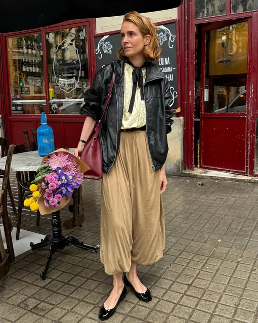 Воздушный фасон топа-халтера и архитектурные линии легких и «дышащих» шароваров рекомендуем сочетать с акцентной грубой бантитской курткой. Она определенно станет неочевидным способом завершить такой бохо-образ и создаст стильный разнотон. На ноги в таком случае лучше всего надеть базовые черные босоножки, балетки или мюли без каблука.