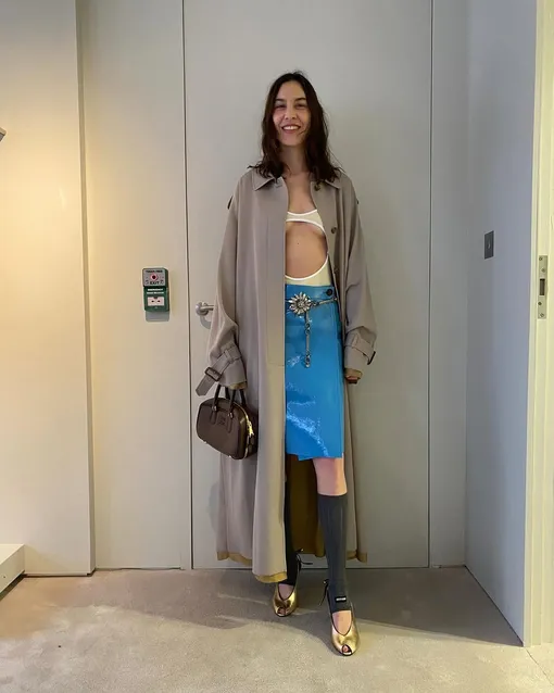 Кто сказал, что боди лучше всего носить только в жару? Этому отпускному предмету гардероба можно найти место и в прохладное время. Выбирайте базовую модель на широких бретелях или смелую вариацию с вырезами. Главное стилизовать боди с предельно закрытыми вещами — например, с акцентной кожаной юбкой длины миди и прямым тренчем в темно-бежевом оттенке, который всегда спасет в случае внезапного дождя.