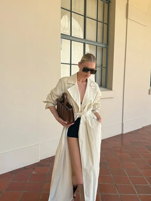 Приз за самый неожиданный микс достается этому контрастному луку из максимально летнего топа-бра и микро-шортов в черном цвете, который можно завершить лучшей верхней одеждой на прохладное время — удлиненным холщовым тренчем. В нем точно не будет холодно — а в случае, если погода наладится, то всегда можно снять эту вещь и остаться в нежарком черном монохроме. Кстати, если топ-бра кажется вам слишком смелым решением, его всегда можно щаменить на более сдержанный, но не менее трендовый халтер.