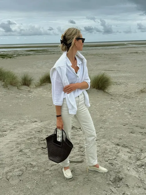 Еще один способ носить одновременно летние и демисезонные вещи — интегрировать в аутфит с льняной рубашкой теплый свитер или джемпер, который обычно очень полезен в осеннее время. Его не обязательно сразу надевать на рубашку — рекомендуем повязать его на бедра или плечи, откуда свитер всегда можно снять и использовать по назначению в случае неожиданного похолодания.