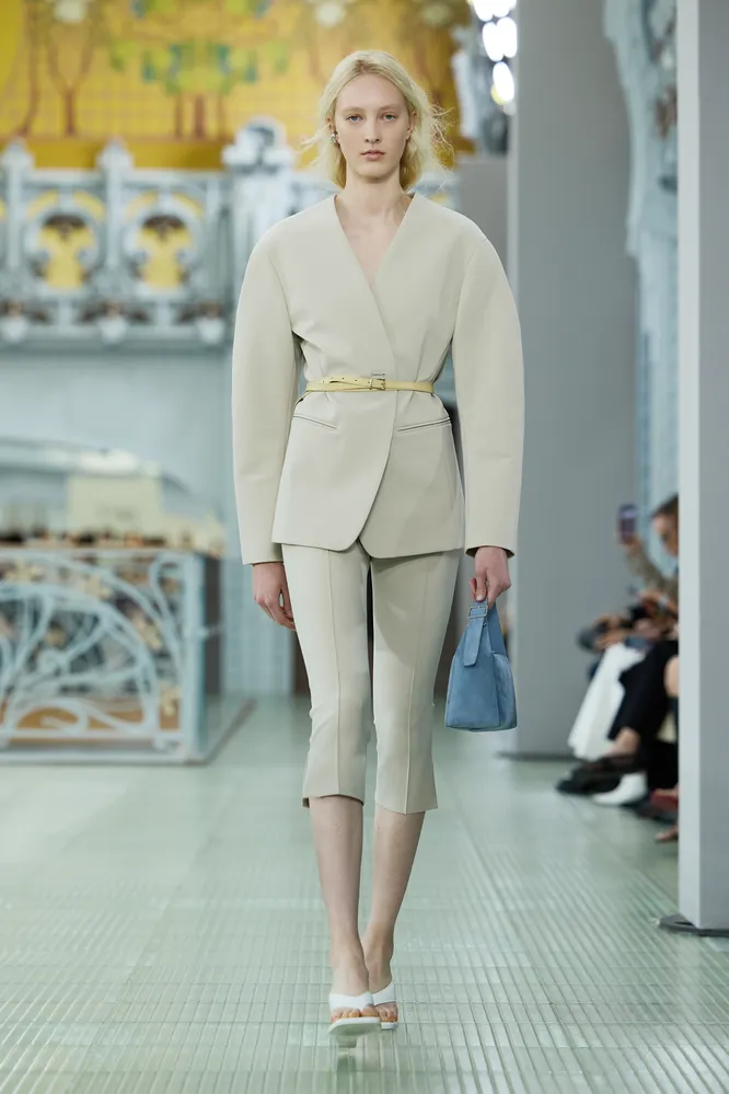 Главный вопрос сезона — где проходит линия талии. Ответ дизайнеров звучит уверенно: чем ниже, тем лучше. Отправной точкой этой тенденции принято считать показ Александра МакКуина «Нигилизм» весна-лето 1994, где появились легендарные «бамстеры». Они задали новое направление силуэта и переосмыслили пропорции фигуры. Однако предпосылки формировались задолго до МакКуина. Весной 2026 низкая посадка снова становится заметным элементом модного языка и встречается в разных интерпретациях: от строгих костюмных версий до расслабленных опций.