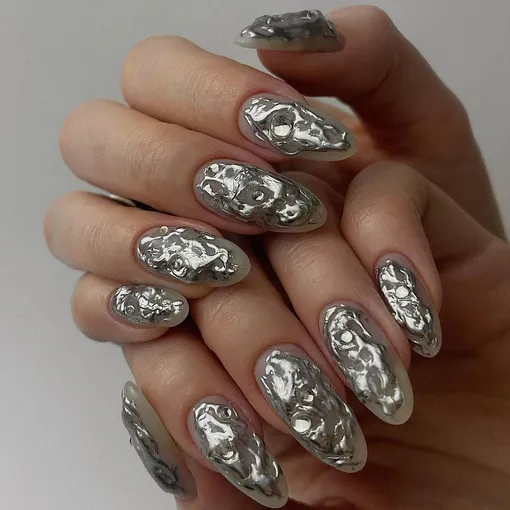 Один из самых эффектных дизайнов сезона выглядит так, будто вы расплавили слиток золота или серебра и покрыли им свои ногти. Вариаций исполнения великое множество. Тем, кто привык к экстравагантным дизайнам, рекомендуем сделать объемное покрытие, напоминающее помятую фольгу. Конечно, придется провести не один час в кресле у мастера маникюра, но результат вас не разочарует. Если такие изыски — не для вас, выбирайте однотонное «зеркальное» покрытие: его легко добиться при помощи специальной втирки. Выбирайте классическое серебро или золото, цветной «металл» или «хромированное» покрытие, переливающееся всеми цветами радуги. Если полностью «металлические» ногти кажутся вам слишком яркими, попробуйте использовать металлик для френча. Тогда маникюр будет выглядеть довольно минималистично, но при этом намного интереснее, чем с белыми или цветными «кончиками».