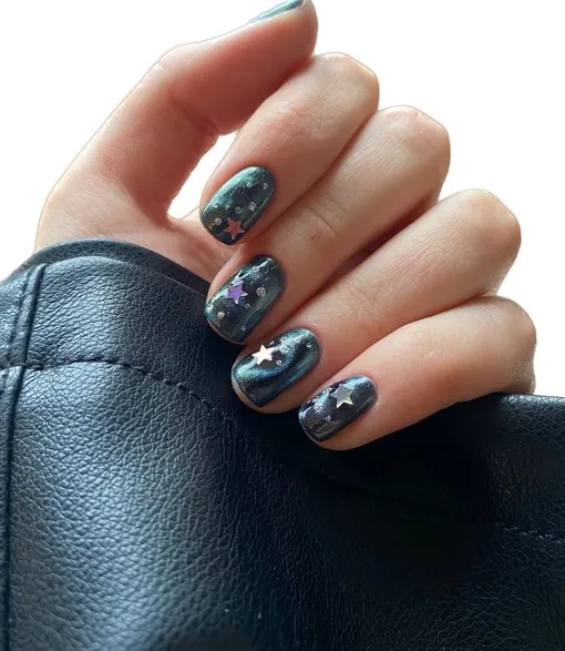 Идеальный маникюр для всех поклонников космоса и всего, что с ним связано. Здесь нет никакой конкретной формулы, главное — космическая тематика. Любители сложного нейл-арта могут изобразить любимые созвездия, солнце и луну, все планеты и даже Плутон — здесь важно лишь найти подходящего мастера, который сможет воплотить все ваши идеи в том виде, в котором вам хочется. Есть и более простые в исполнении, но не менее эффектные варианты. Например, можно использовать лак хроматик, переливающийся оттенками синего и фиолетового, в качестве фона, а его украсить глиттером, стразами или даже наклейками в виде звезд. Получится импровизированный открытый космос прямо у вас на ногтях.
